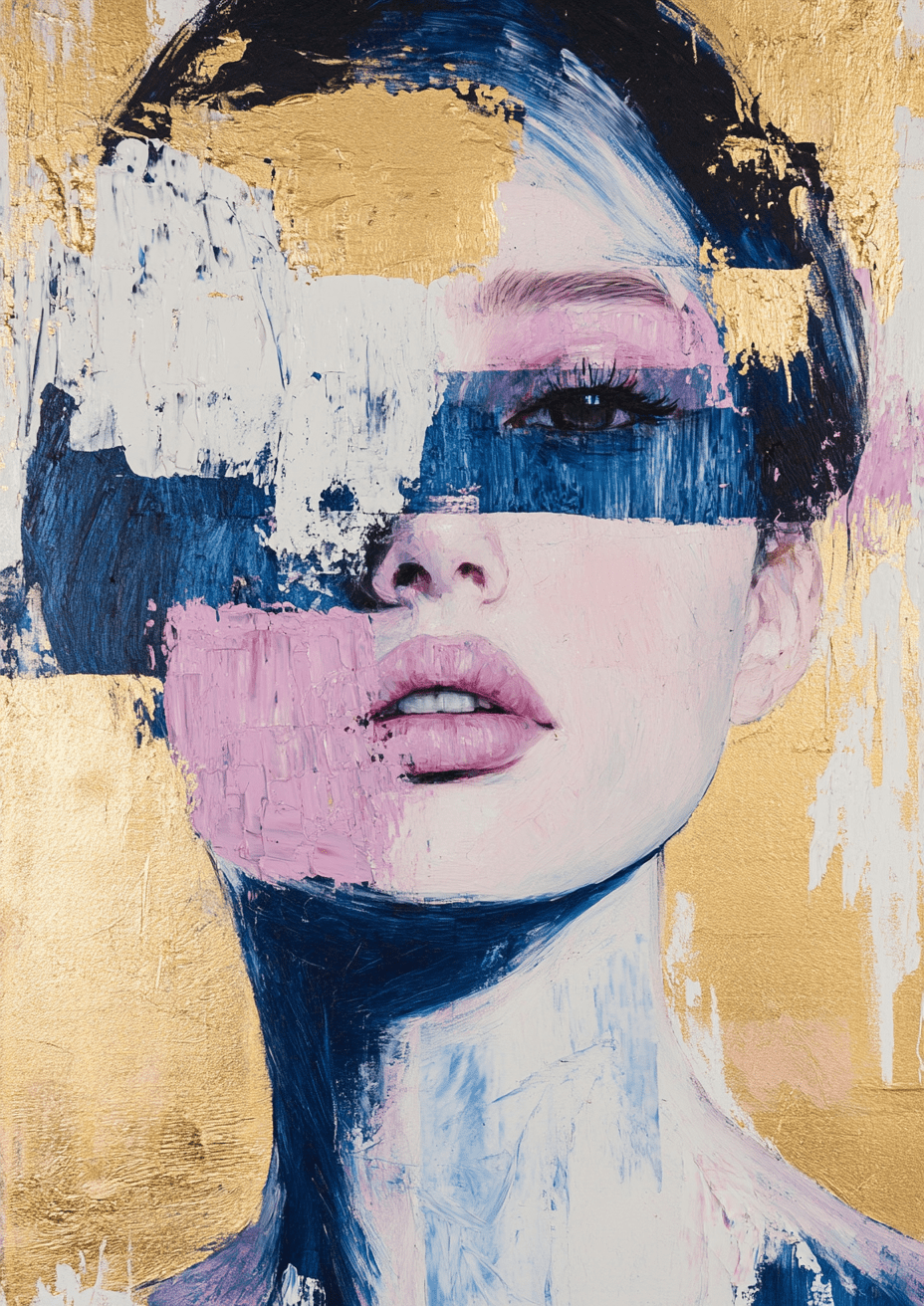 This striking artwork features a close-up portrait that explores themes of identity and perception. The figure’s face is partially obscured by bold, abstract strokes of deep blue and soft pink, contrasting beautifully with the shimmering gold background.
