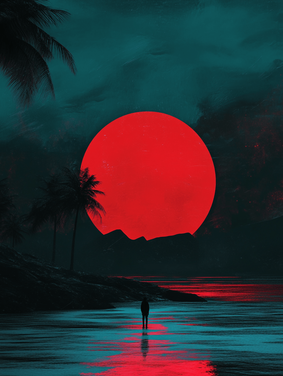 A solitary figure stands on the water’s edge, silhouetted against the reflective surface of the ocean, adding a sense of scale and solitude. The palm trees frame the composition, enhancing the tropical vibe while contributing to the overall atmosphere of tranquility mixed with drama.