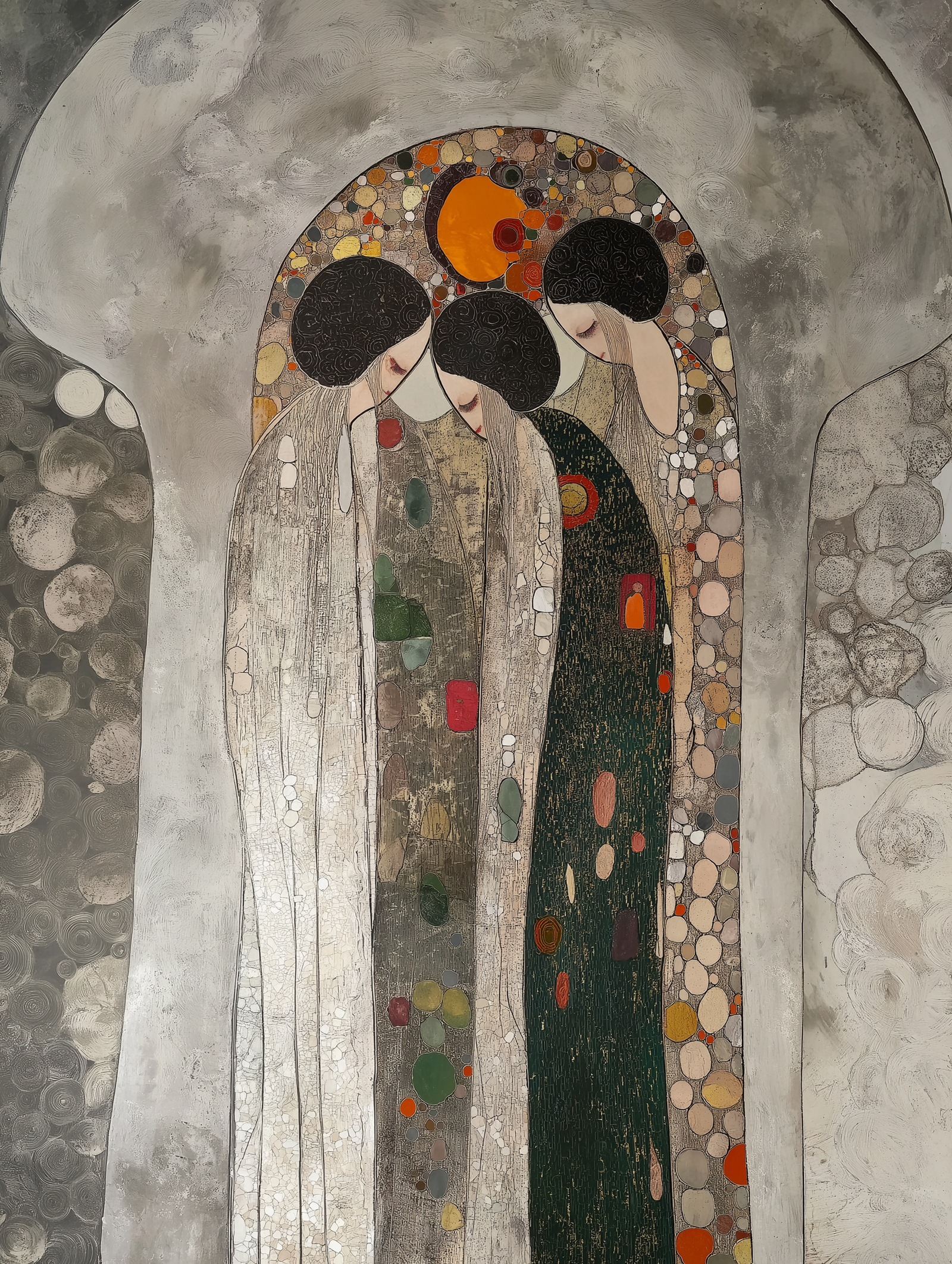This enchanting artwork depicts three figures huddled closely together, their elegant forms rendered in soft, muted tones. The use of intricate patterns and textures enhances the sense of harmony among them, while their flowing garments create a seamless connection.