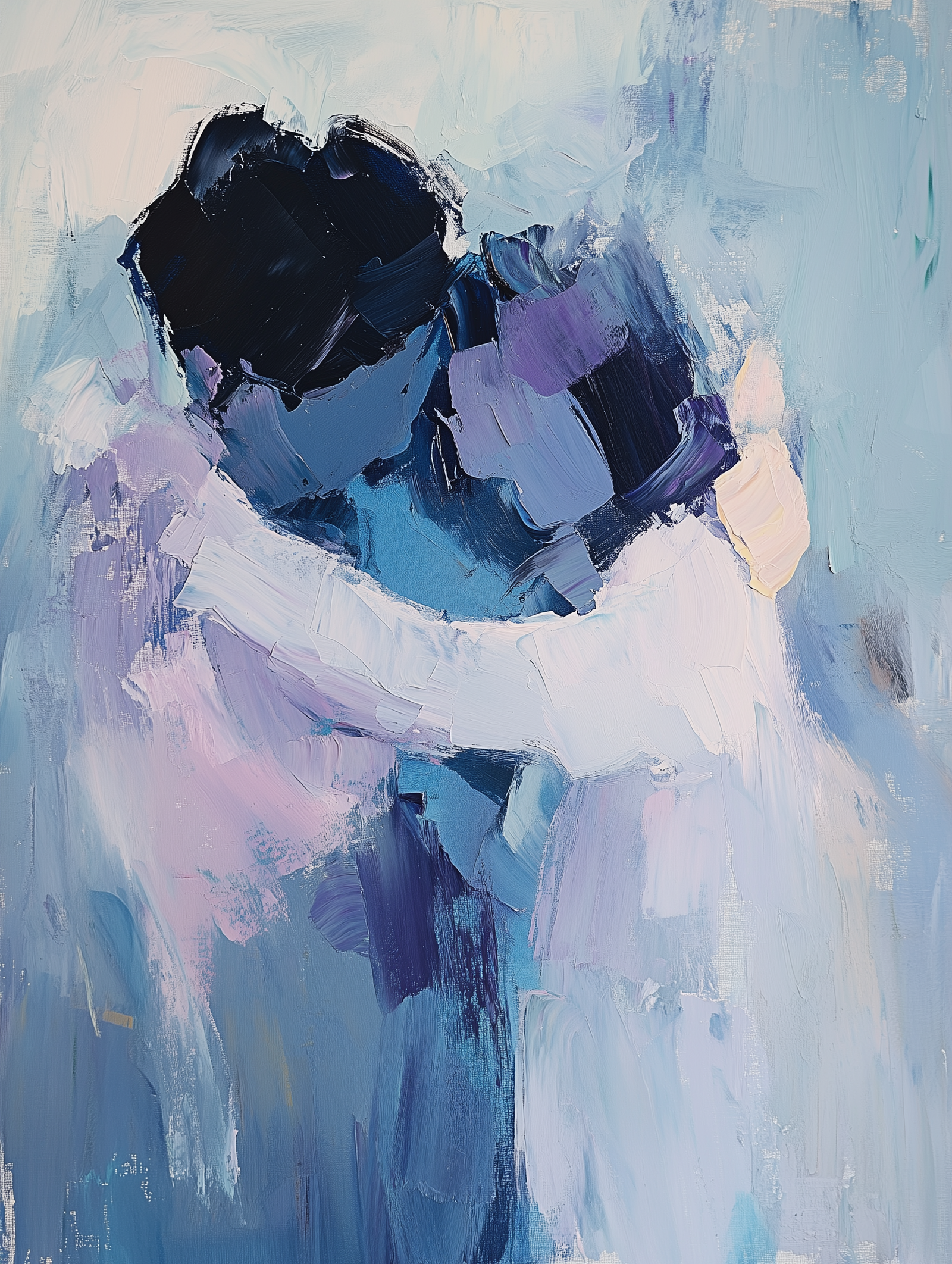 This expressive artwork portrays two figures locked in a heartfelt embrace, their forms blending seamlessly with soft, flowing brushstrokes. The palette of cool blues and gentle pastels creates an atmosphere of calm and intimacy.