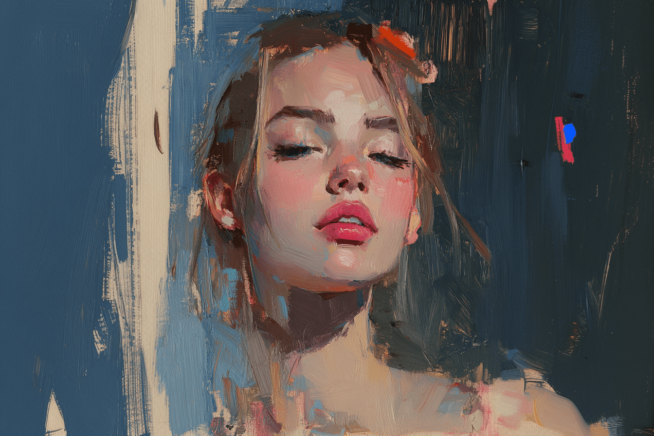 This stunning portrait merges realism with abstract expression, featuring a young woman with soft, delicate features captured in a moment of introspection. Her eyes are gently closed, conveying a sense of peace and tranquility. The artist employs bold brushstrokes and a rich color palette, blending warm and cool tones to create a captivating visual experience.