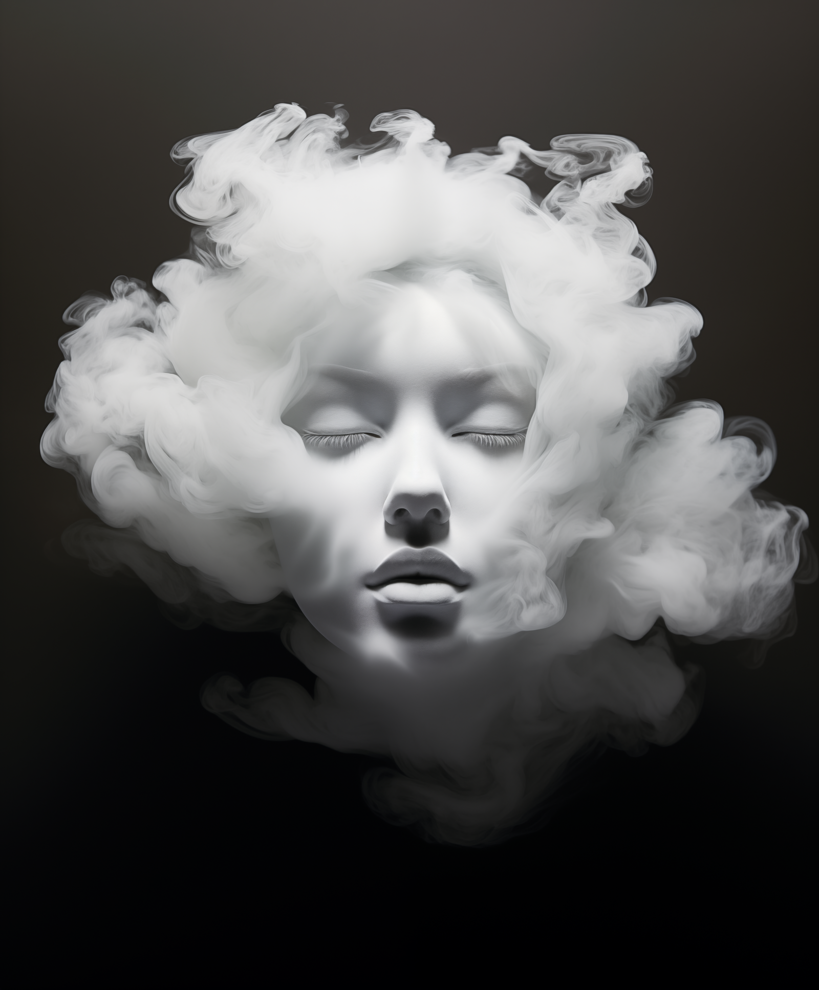 In this mesmerizing portrait, a serene face emerges from a swirling mist, enveloped in soft, ethereal clouds of smoke. The figure’s calm expression evokes a sense of tranquility, as if she exists in a realm between reality and dreams. Her features are gently illuminated, contrasting beautifully with the dark backdrop, creating an otherworldly presence.