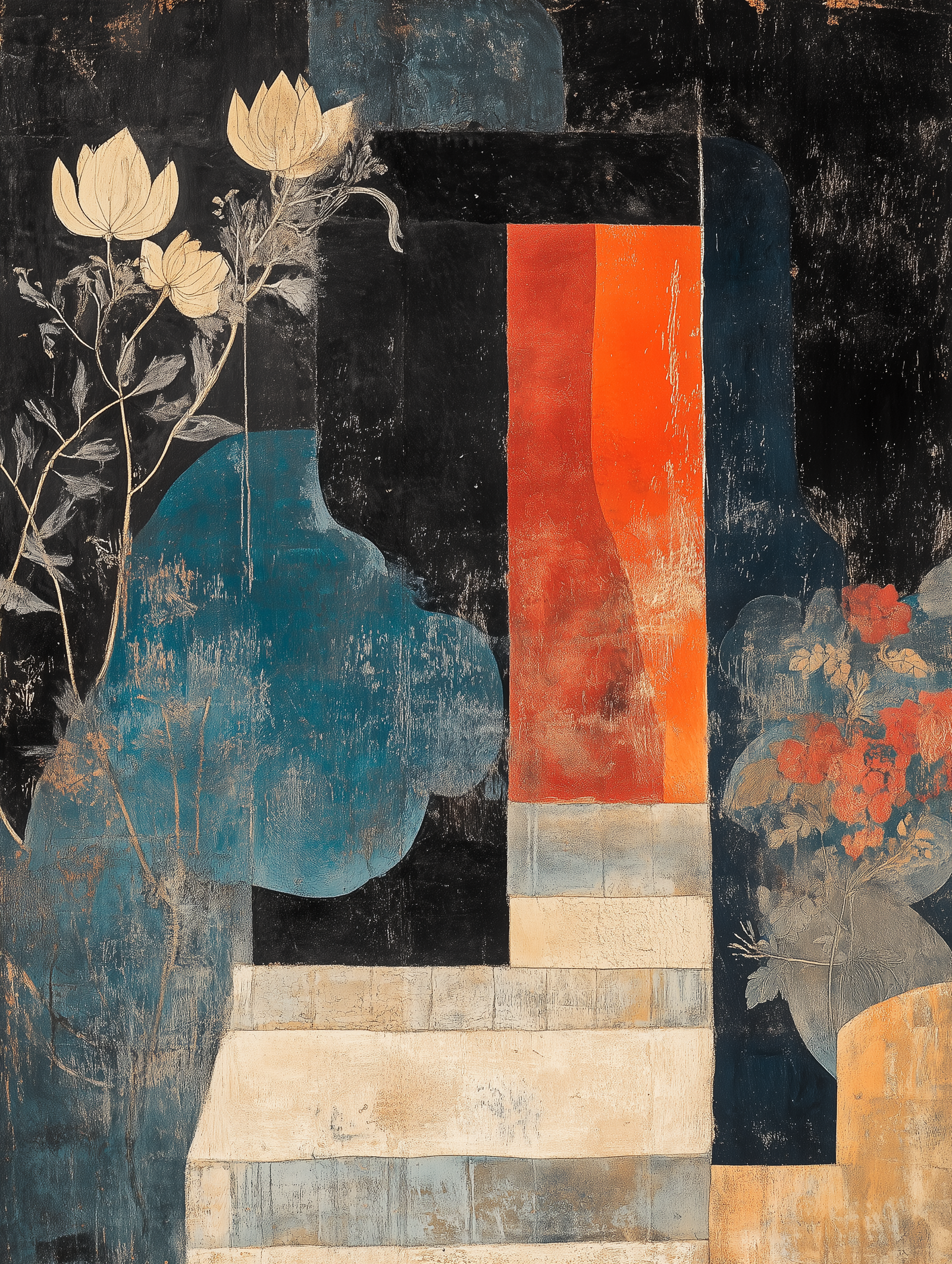 This captivating artwork features an intriguing interplay of shapes and colors, creating a visually striking composition. The use of deep blues and vibrant reds contrasts beautifully with the softer tones of the floral elements.