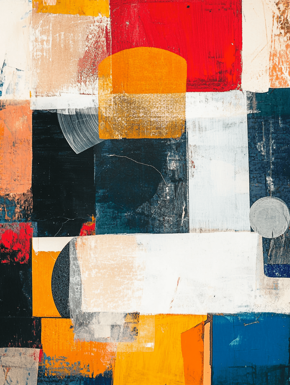 The interplay of light and shadow, along with varied textures, adds depth and intrigue to the piece. The juxtaposition of solid colors against softer tones invites the viewer to explore the balance between chaos and order.