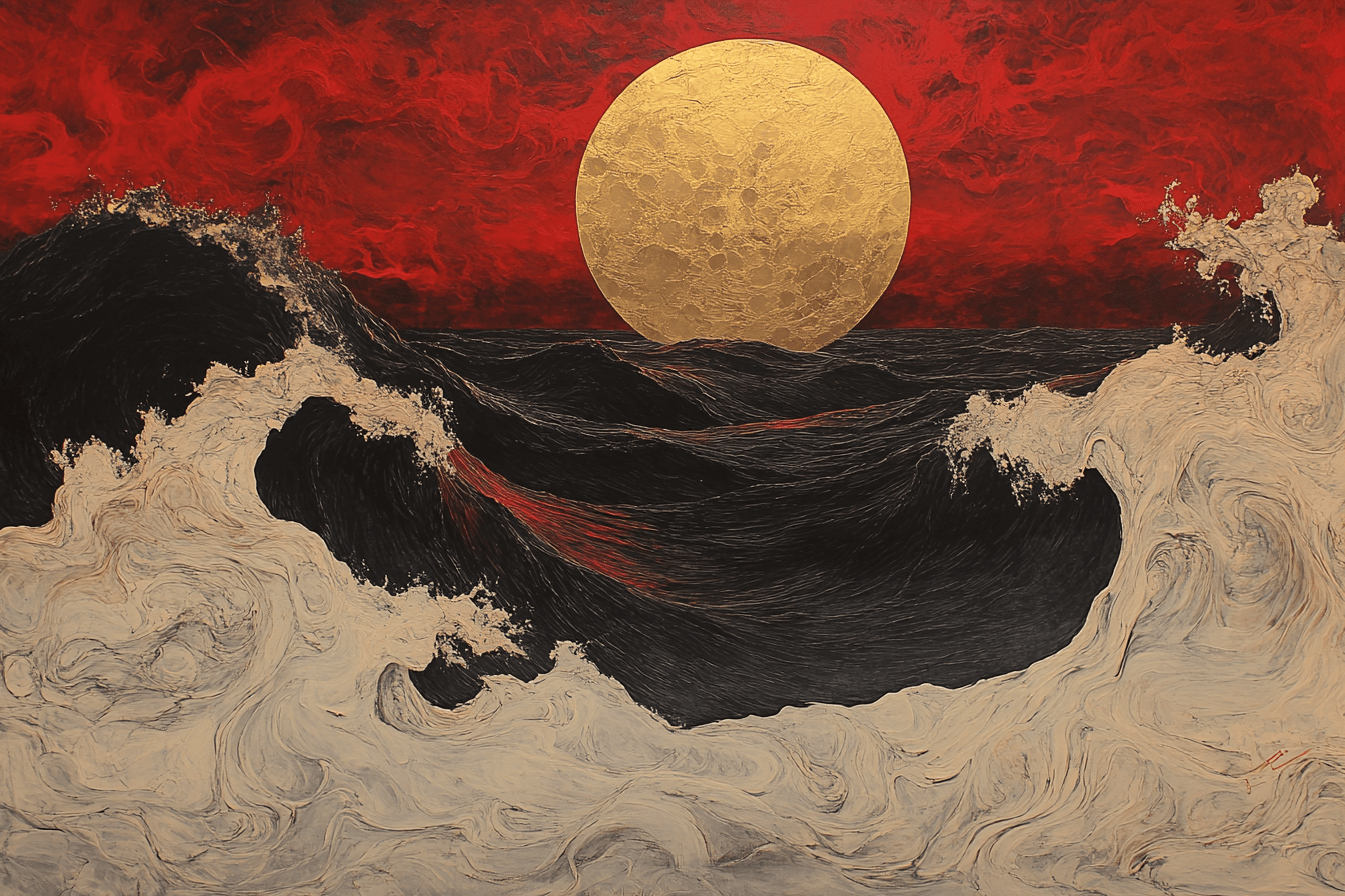 This artwork invites you to witness the dance between chaos and calm, where the ocean’s roar resonates with the heartbeat of the universe. Each wave carries the weight of unspoken dreams, crashing against the shore of time, while the sun, like a guardian, watches over the vast expanse.