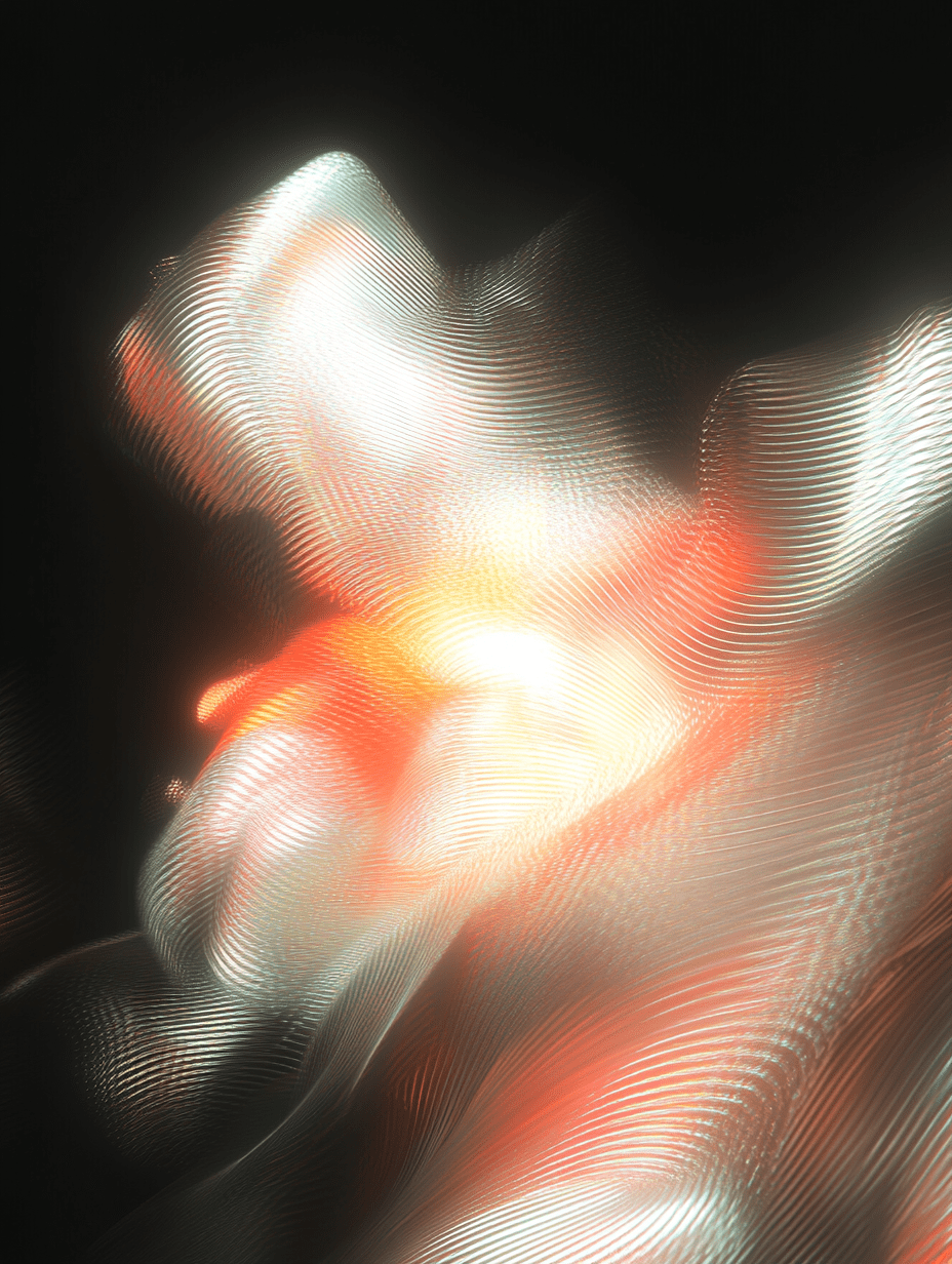 This evocative artwork captures a dynamic interplay of light and form, where swirling, wavy patterns create an abstract representation of movement. The soft glow of reds and yellows emerges from the depths of the composition, contrasting beautifully against the dark background.