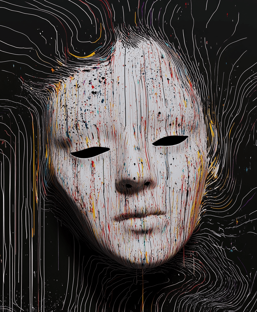 This striking artwork features a mask-like face that appears to be melting, with vibrant paint drips cascading down in a riot of colors. The smooth, white surface of the face contrasts sharply with the chaotic splashes of paint, creating a compelling visual tension.