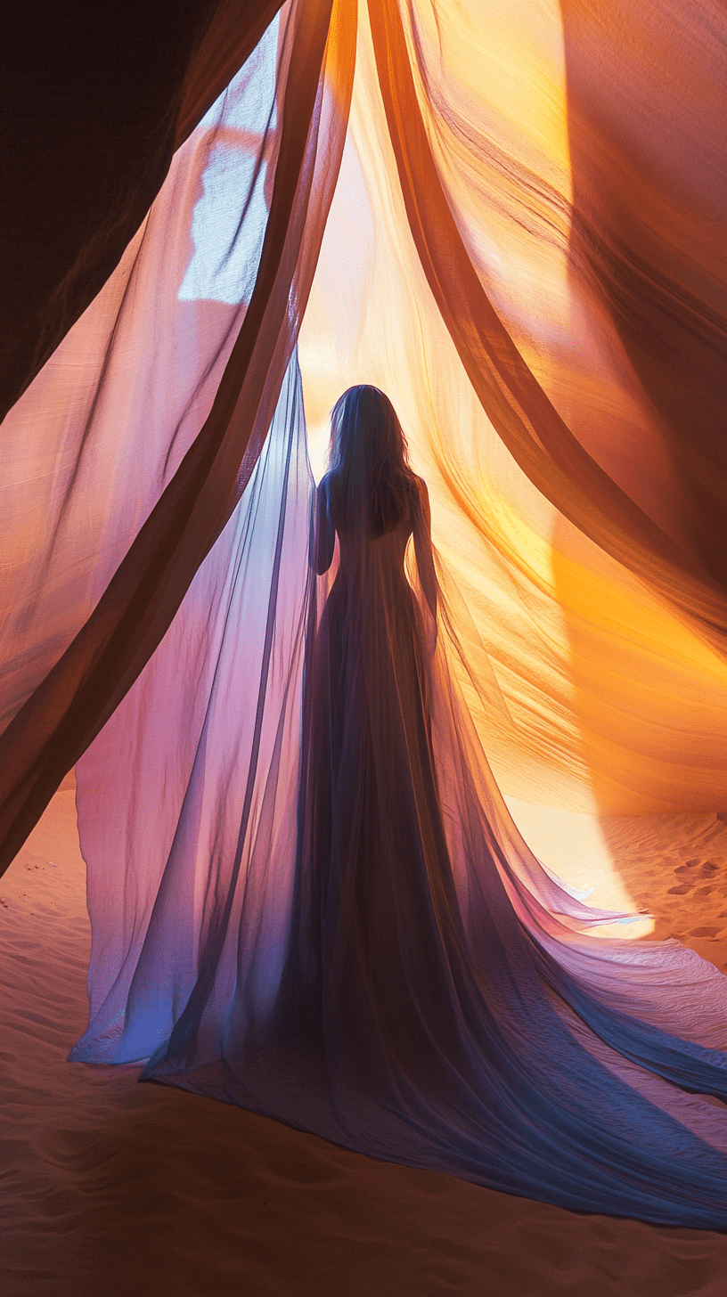 This enchanting artwork features a silhouette of a figure draped in flowing fabric, standing amidst soft, billowing curtains that transition from warm oranges to cool purples. The interplay of light and color creates a dreamlike atmosphere, evoking a sense of tranquility and wonder.
