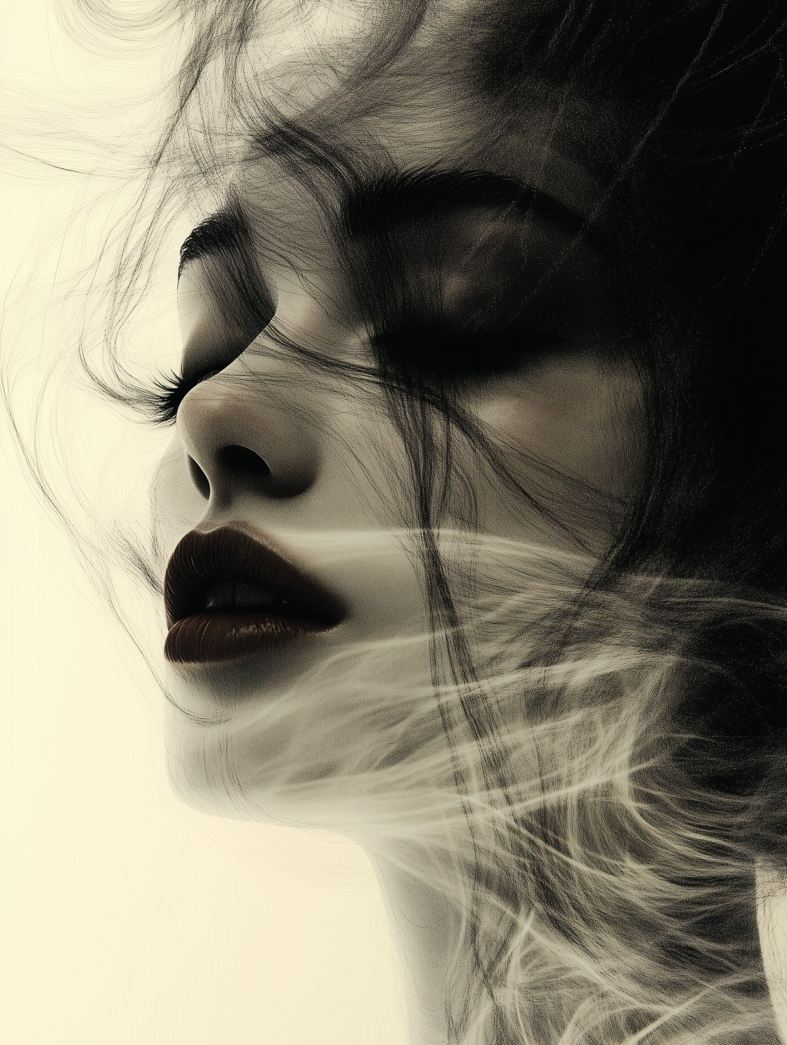 This exquisite piece features a close-up of a woman’s face, softly illuminated to highlight delicate features and alluring contours. Wisps of ethereal smoke or hair flow gracefully around her, creating a sense of movement and fluidity that enhances the overall composition.