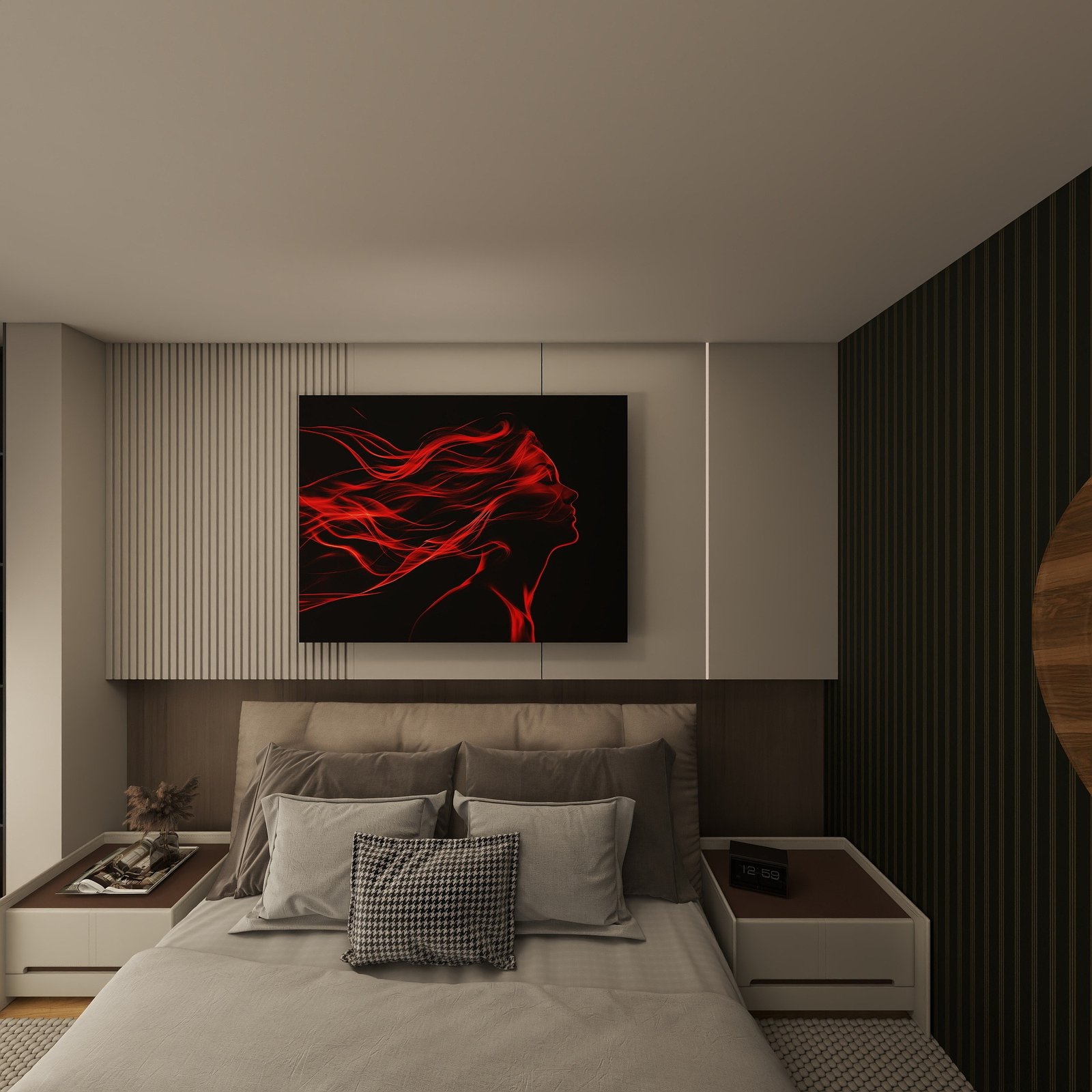 This striking artwork showcases a profile of a figure adorned with flowing red strands that evoke a sense of movement and vitality. The bold red against the dark background creates a dramatic contrast, emphasizing the fluidity of the hair and the contours of the face.