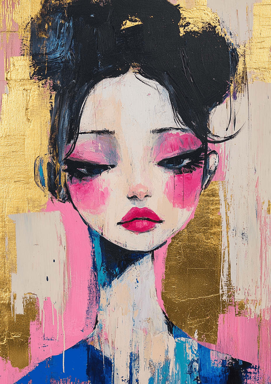 This captivating artwork features a portrait of a young woman with an expressive face, characterized by soft pastel hues and striking gold accents. Her large, soulful eyes and prominent pink cheeks convey a sense of vulnerability and grace.