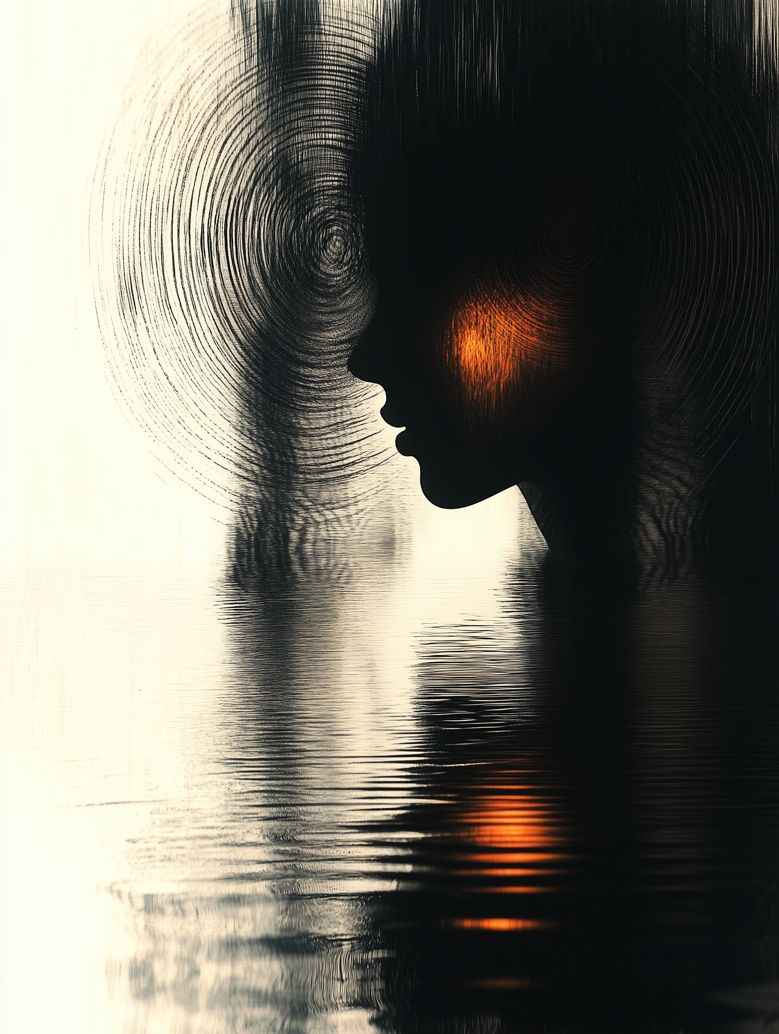 This intriguing artwork features the silhouette of a face, set against a backdrop of swirling patterns and rippling water. The soft, circular lines create a sense of depth and movement, suggesting an inner world of thoughts and emotions.