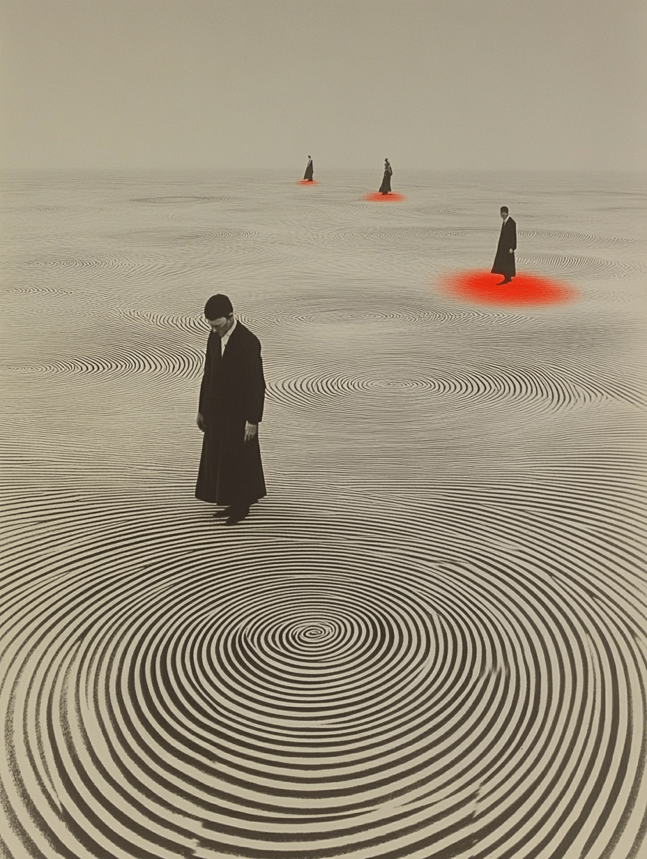 This evocative piece features a surreal landscape marked by concentric circles that draw the viewer’s eye toward the horizon. Silhouetted figures dressed in dark attire wander through this monochromatic expanse, their presence punctuated by striking red spots that symbolize focal points of significance or emotion.
