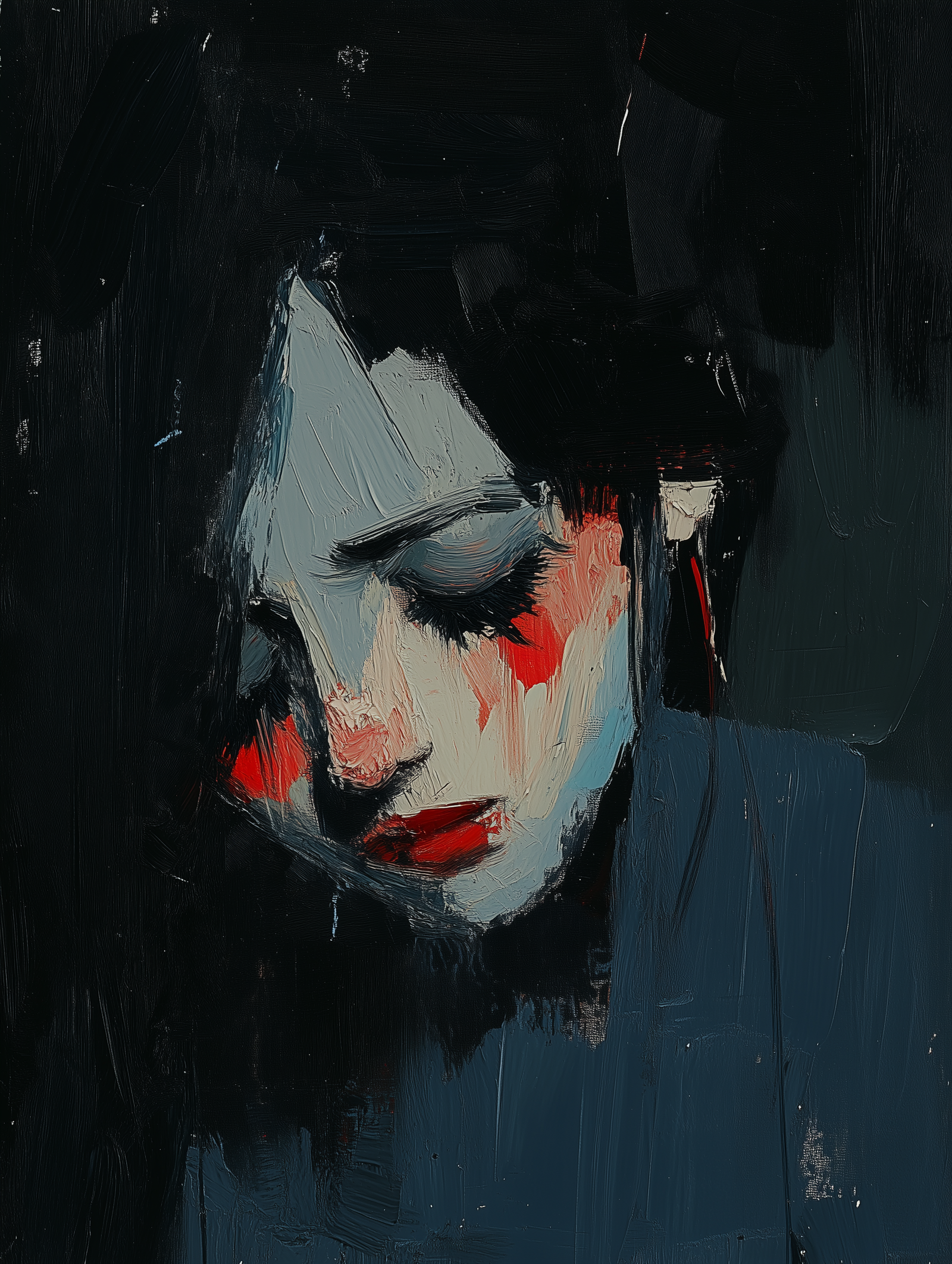 This powerful artwork captures a figure in a moment of introspection, their expression conveying a deep sense of emotion. The use of dark tones contrasts with the striking red elements, emphasizing the intensity of the subject’s feelings.