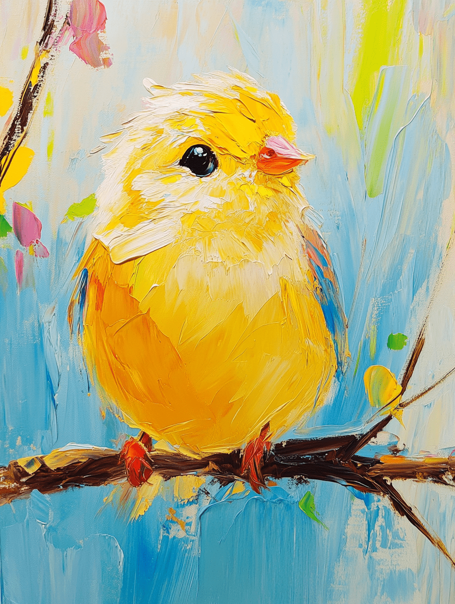 This delightful artwork features a fluffy, vibrant yellow bird perched on a branch, radiating warmth and happiness. The use of thick, textured brushstrokes adds depth and dimension, making the bird appear almost three-dimensional against a soft, colorful background.