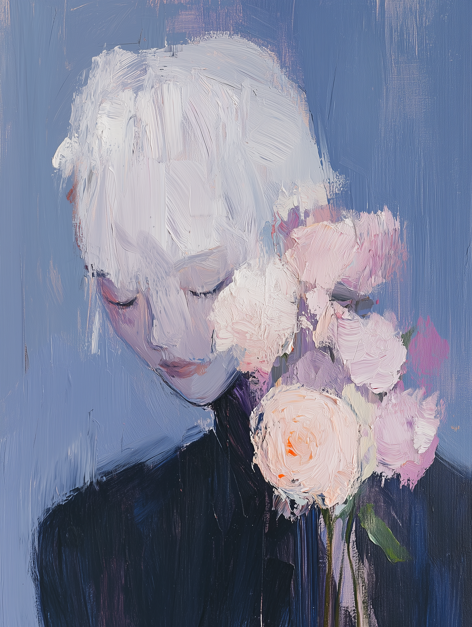 This striking artwork features a figure with a serene expression, gently cradling a bouquet of soft pink roses. The ethereal quality of the figure is emphasized by the use of muted colors and soft brushstrokes, creating a dreamlike atmosphere.