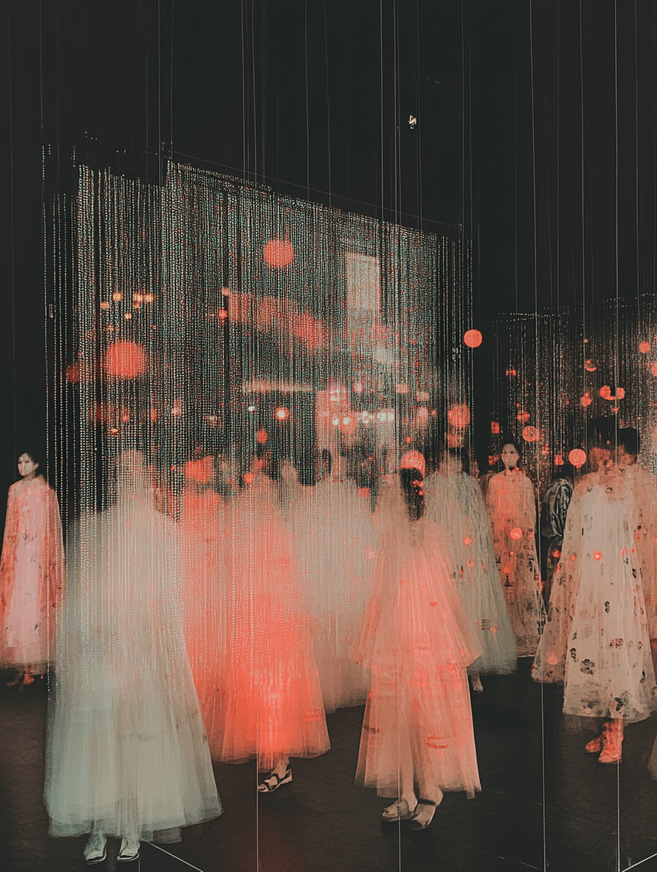This mesmerizing piece features ethereal figures draped in flowing garments that blend seamlessly with a backdrop of shimmering lights. The translucent curtain of strands creates a dreamlike atmosphere, transforming the scene into a harmonious interplay of fashion and technology.